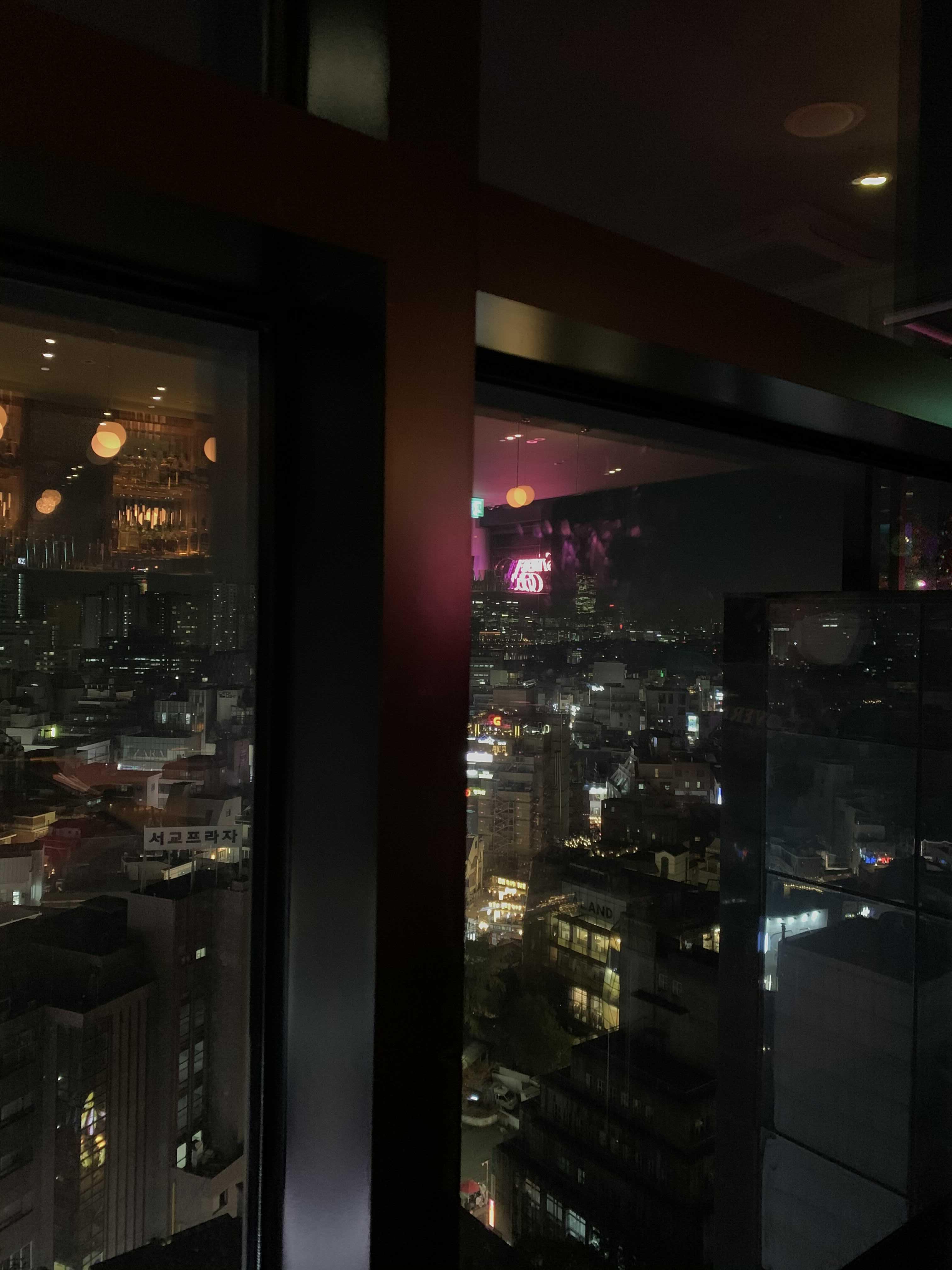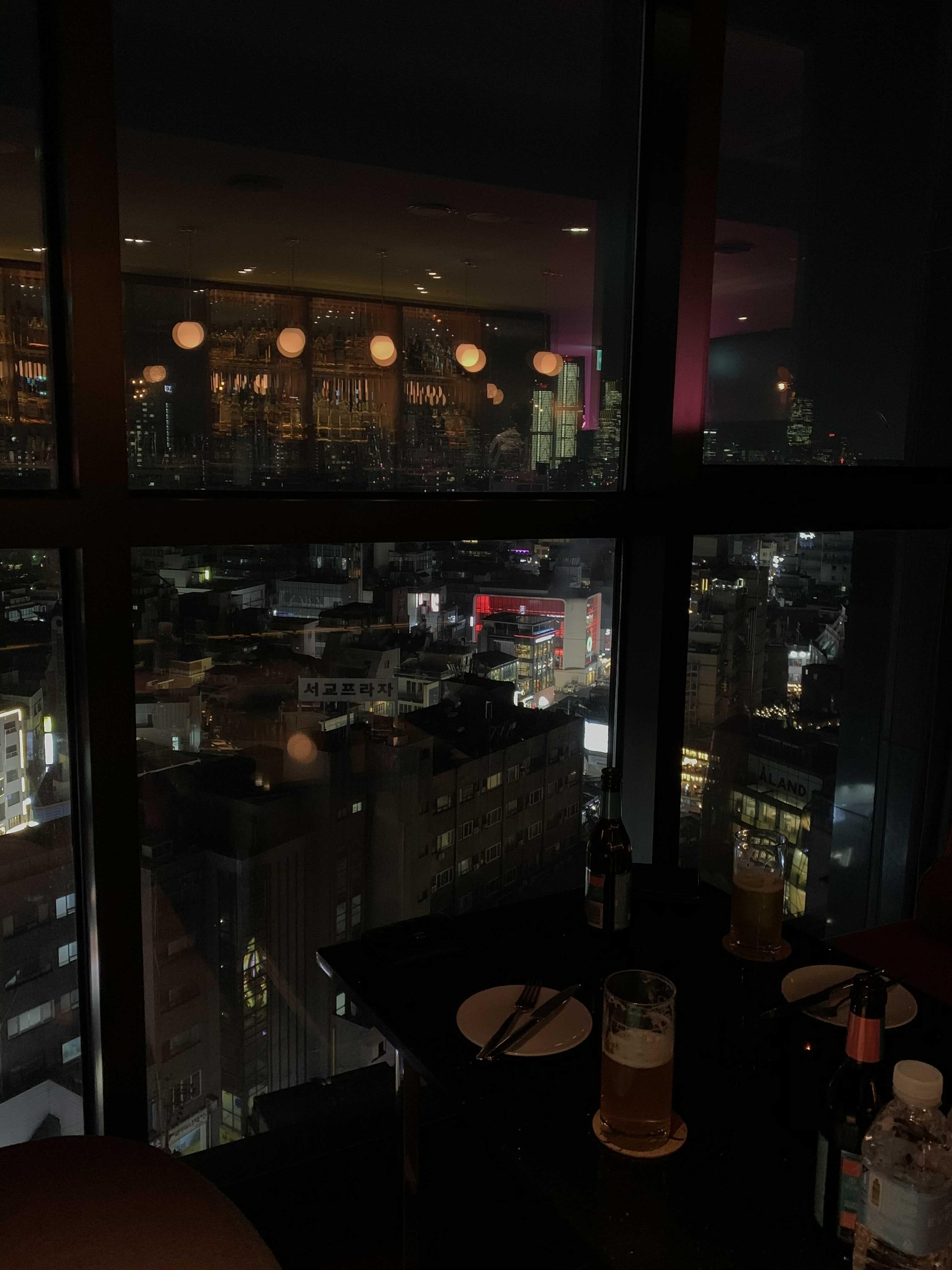 우리 테이블 뷰. 홍대입구역 메인거리 맞은편이 훤히 보인다. 휘황찬란한 느낌은 아니었지만 조명이 비춰진 모습이 충분히 글램하고 예뻤다. :)